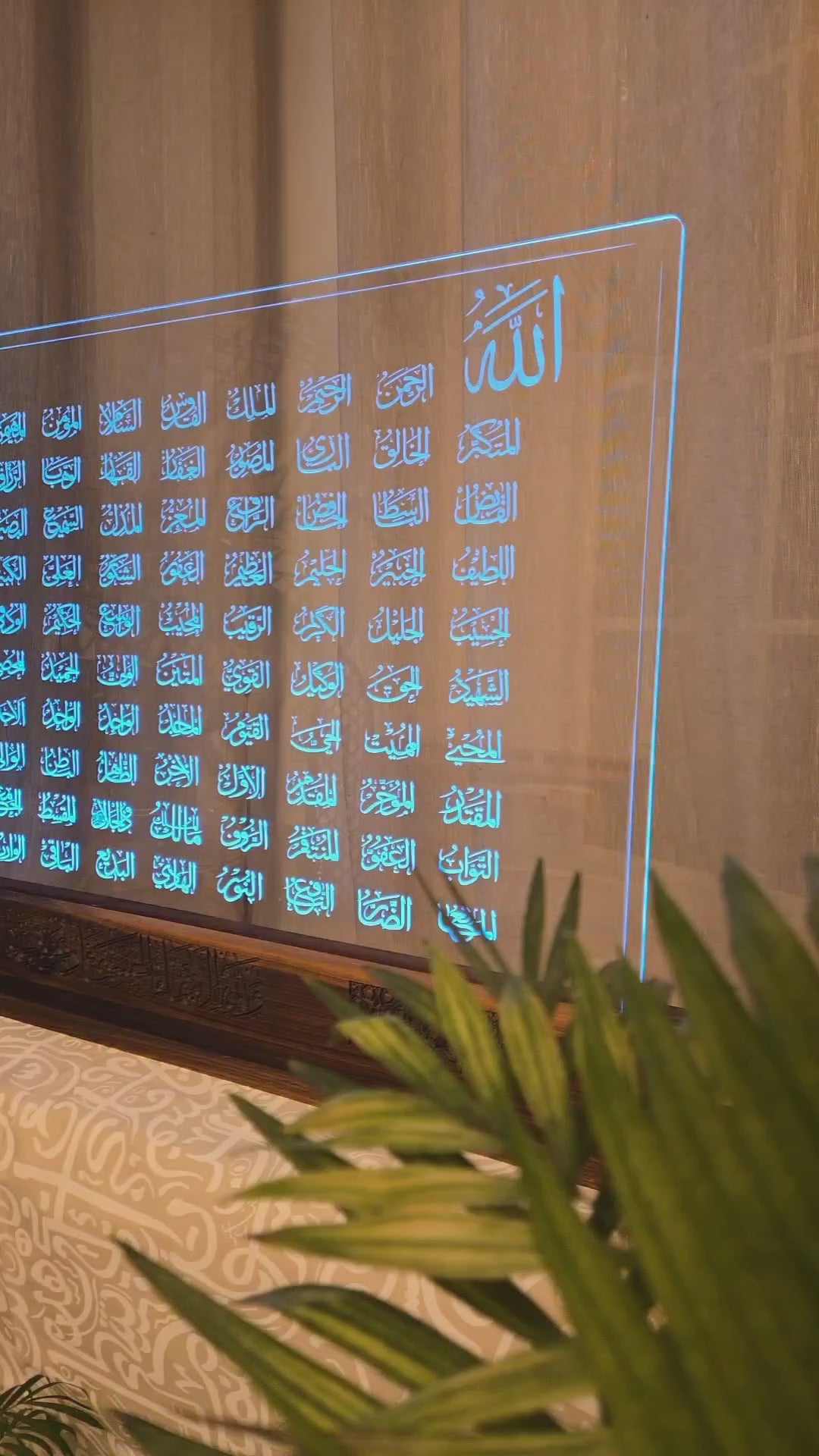 The 99 Names of Allah: a beautiful piece of Islamic art featuring an acrylic with engraved letters that light up with the ability to change the light colours with remote control. The frame rests on an elegantly engraved walnut wood base. This stunning display of the 99 Names of Allah is sure to be a captivating feature in any room, adding a touch of spirituality and elegance.
